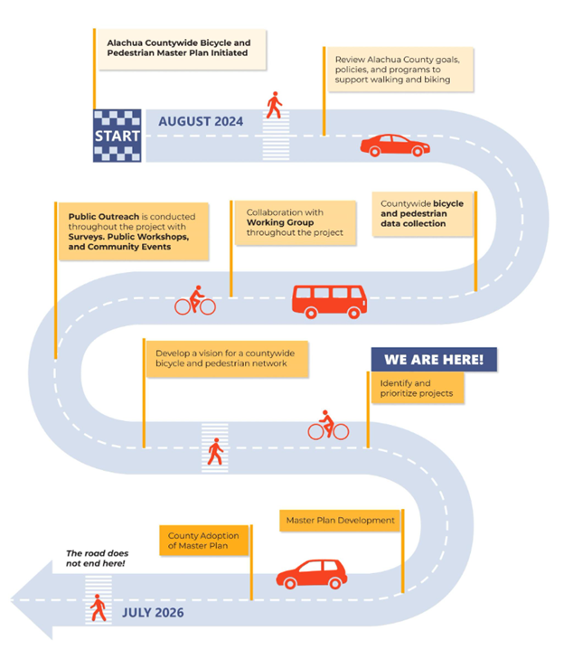 Alachua County is preparing a Countywide Bicycle and Pedestrian Master Plan that will provide guidance for future development and redevelopment of the County’s bicycle and pedestrian facilities. The Master Plan will: